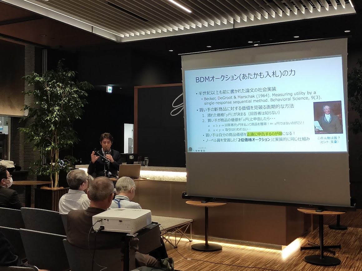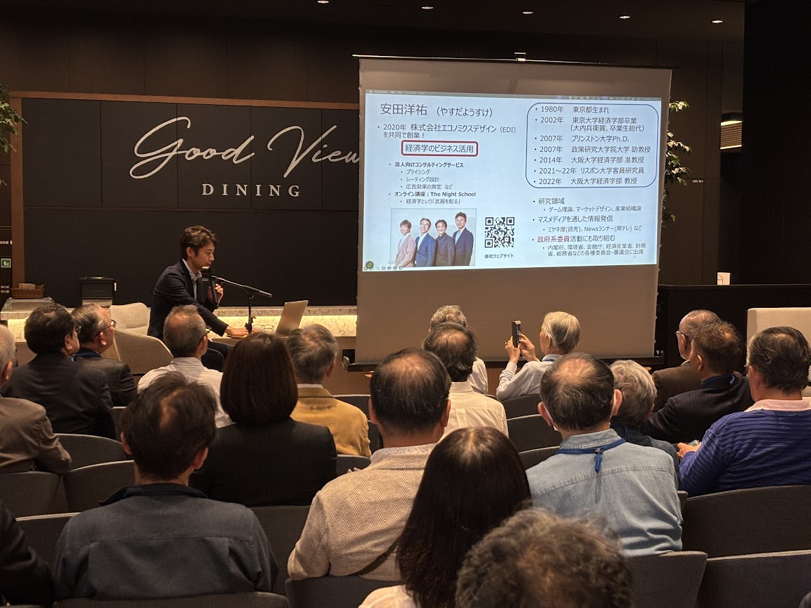 ご講演は、文豪ゲーテがBDMオークションを活用して高額の原稿料を得た逸話から始まりました。続いて、ゲーム理論を応用した法人向けコンサルティング「マーケット・プライシング」、さらに日本経済における「ブラック均衡」(安田先生の造語)に関する提言や人材マッチングの具体例まで、わかりやすく解説していただきました。参加者の関心は尽きることなく、所定の1時間を超えても話題は続き、懇親会やQ&Aコーナーの時間を削っての熱気あふれる講演となりました。