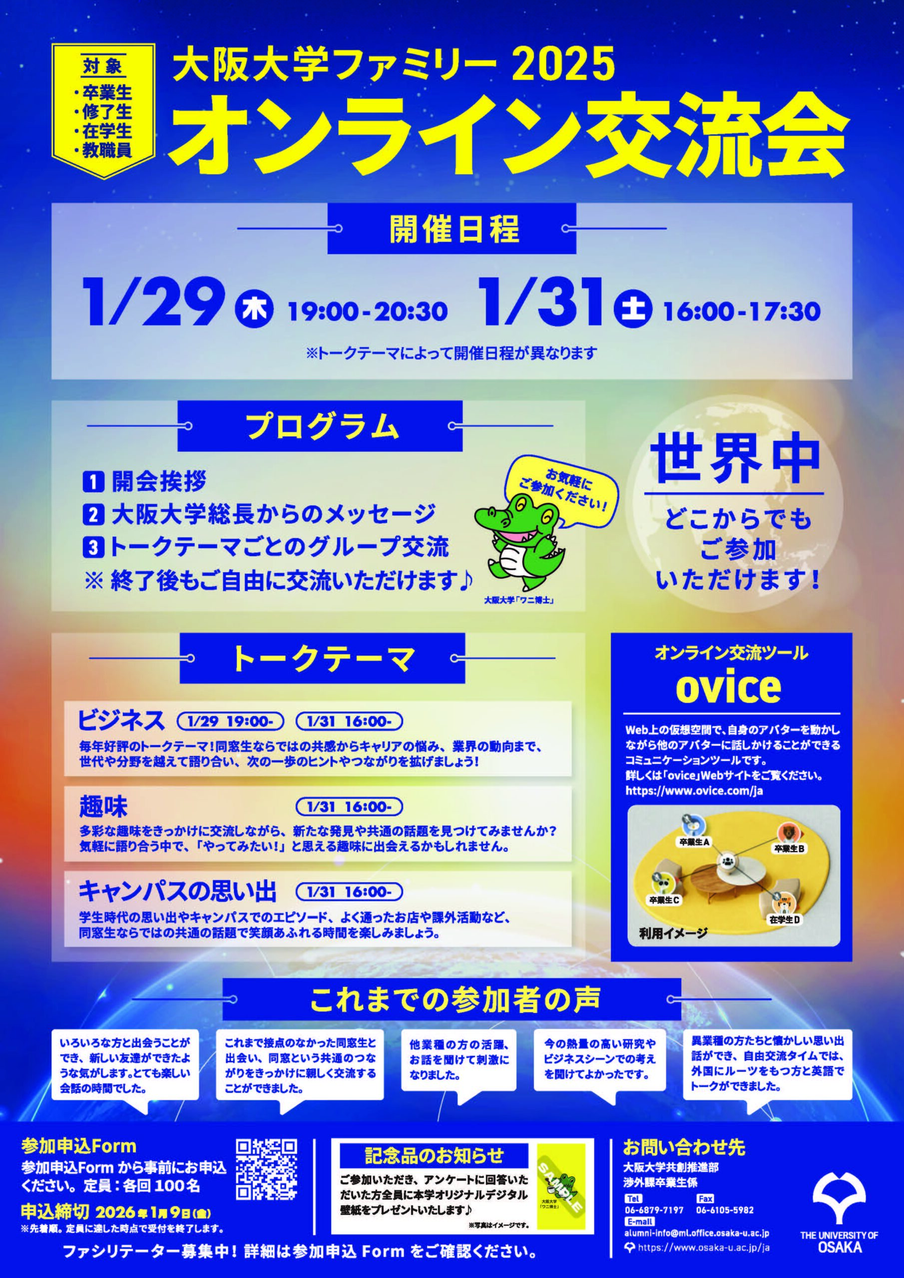 大阪大学共創推進部渉外課卒業生係より、「大阪大学ファミリー2025オンライン交流会」のご案内です。